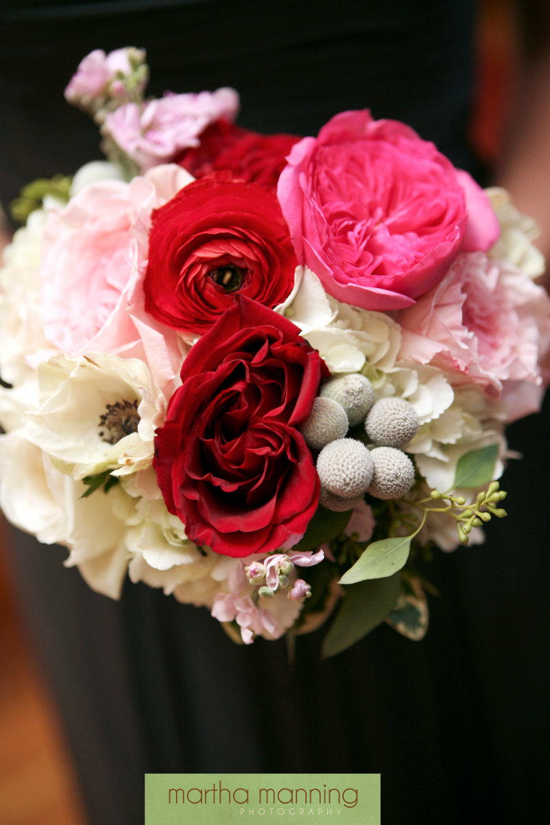 Thank you to Martha Manning for these amazing images from a beautiful December wedding at the Carolina Inn. The colors were rich reds, shades of pink, whites/ivories and an accent of gray. And the flower combination was amazing – peonies, ranunulus, garden roses, astible, dusty miller, berries, hydrangeas.